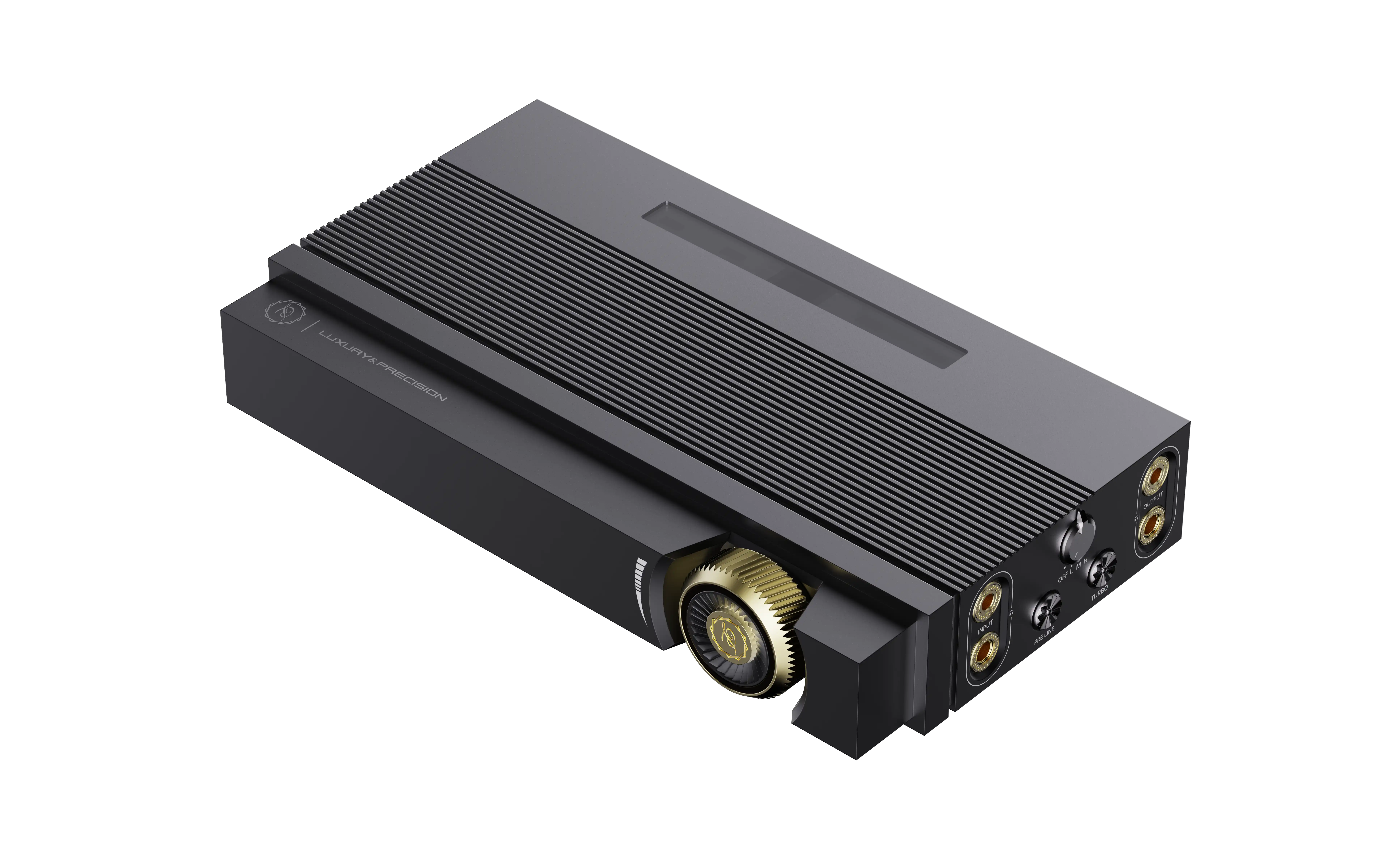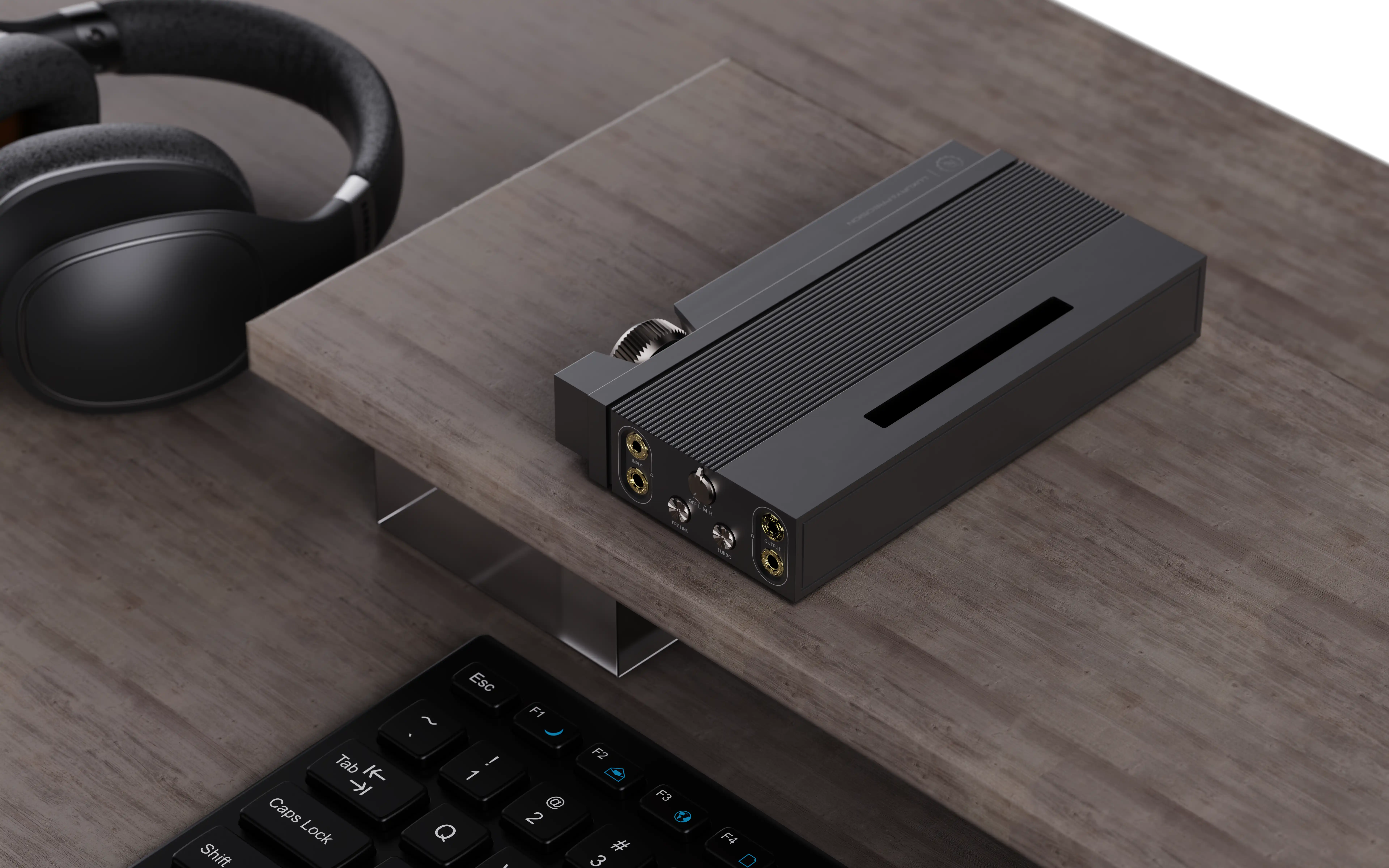 以精密工艺为核心,全金属哑光黑机身线条方正,边角打磨细腻,紧凑尺寸兼顾便携与操作空间。透明小窗搭配电子管蓝光,兼具科技感与复古韵味。物理拨杆、旋钮有序排布,音量旋钮红区警示贴心,隐藏式接口与防滑设计提升实用性。整体以黑色金属质感塑造出便携又不失格调的高端音频设备视觉风格。