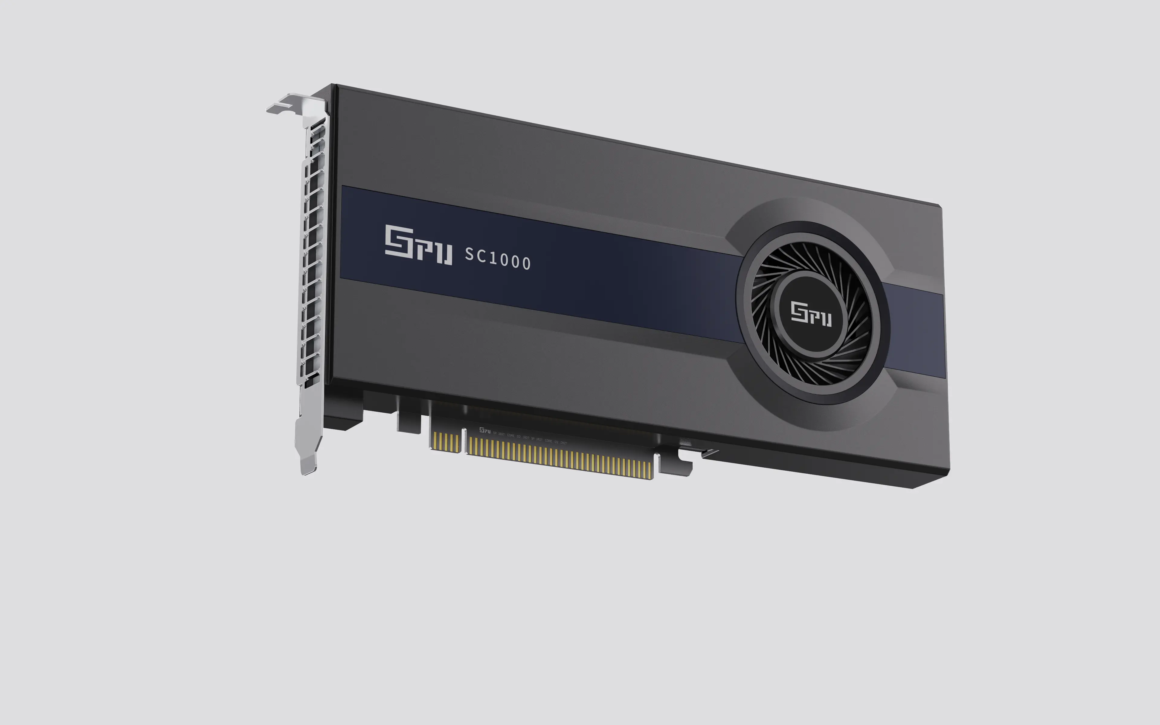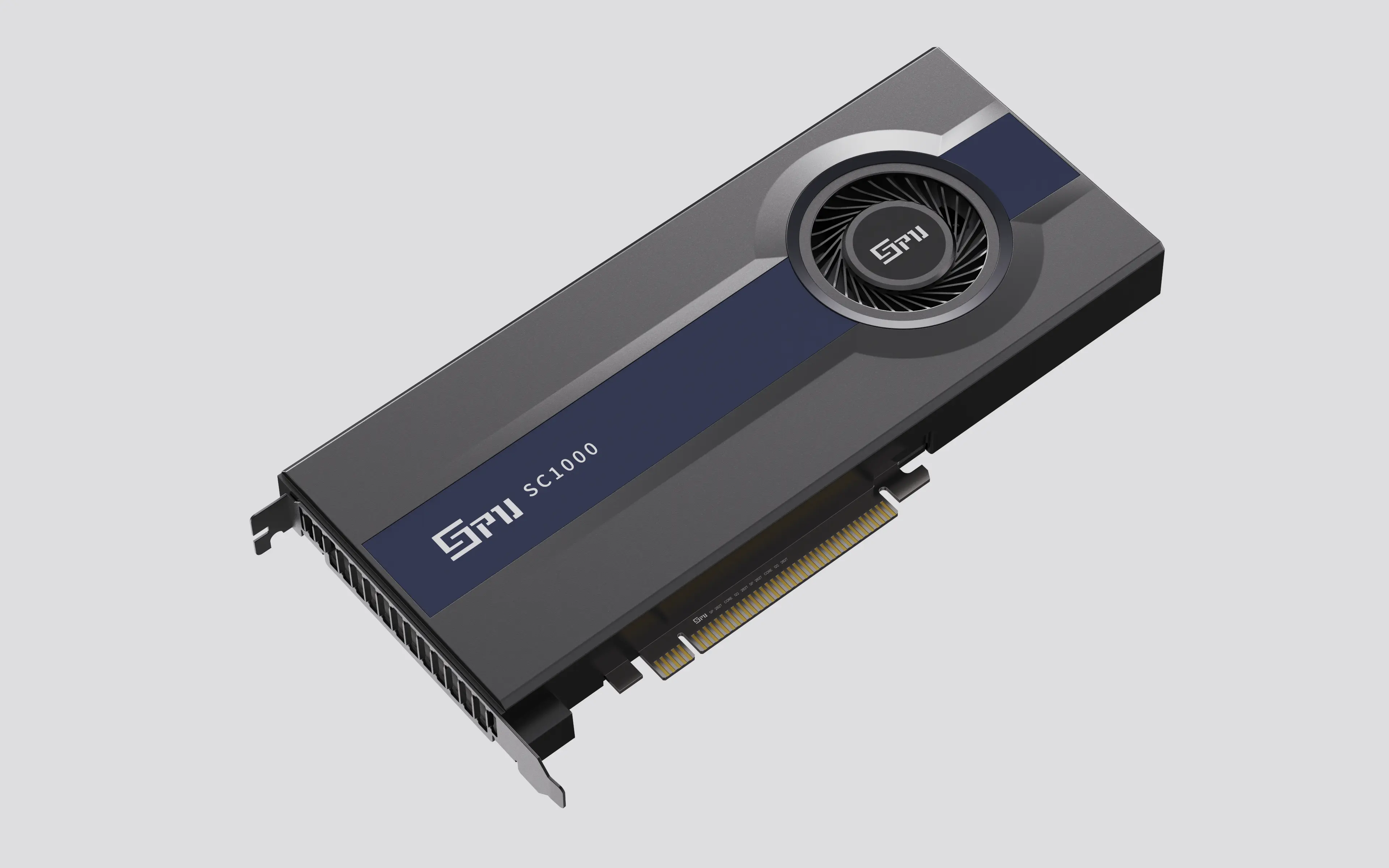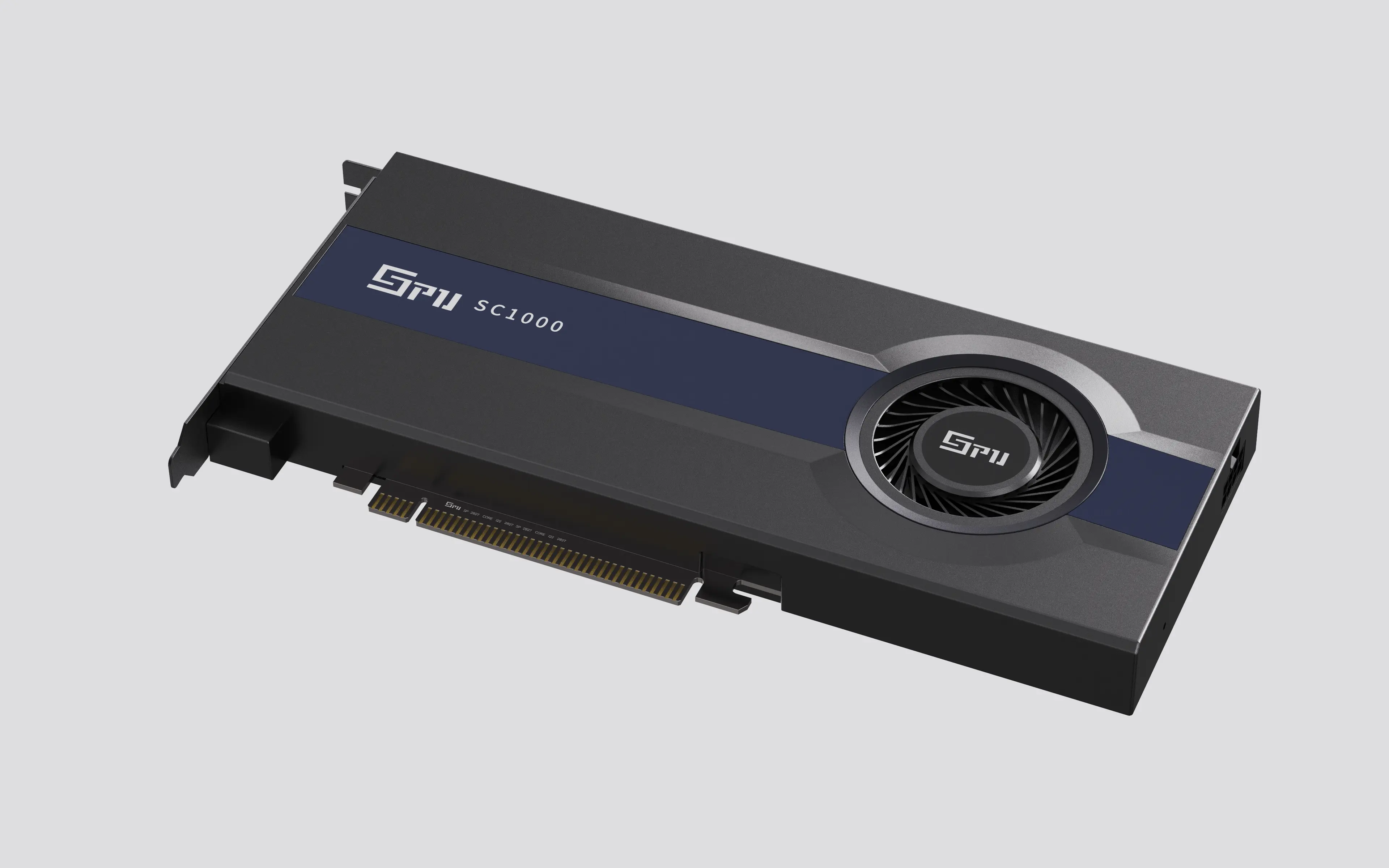 以极简工业美学为核心,机身采用深灰与藏蓝撞色设计,120mm 单涡轮风扇与散热鳍片一体化布局,兼顾高效散热与紧凑结构。金属拉丝面板、CNC 倒角工艺提升质感,居中涡轮风扇集成品牌标识强化效能,金手指接口与尾部支架的模块化设计兼顾兼容与稳定。整体打破传统产品炫光冗余,塑造冷静高效、专业可靠的视觉形象,适配专业场景审美需求。